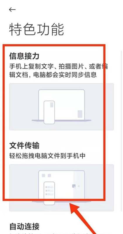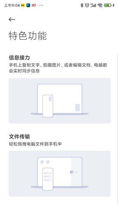 浏览功能详情进入特色功能页面后,可上下滑动查看具体功能介绍,包括跨设备协同、文件互传等特性。