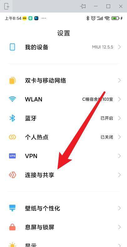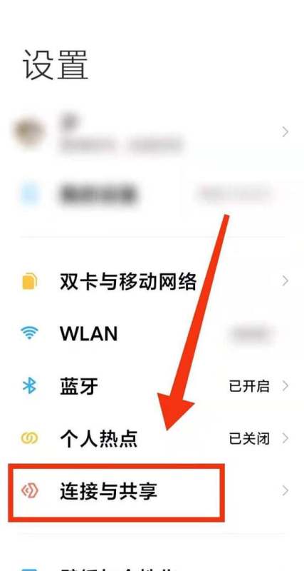 选择连接与共享选项在设置菜单中滑动查找“连接与共享”功能项,点击进入该模块。