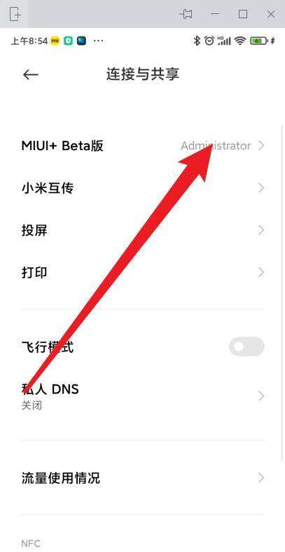 进入MIUI+Beta版设置在连接与共享界面中,找到“MIUI+Beta版”选项并点击,进入专属功能管理页面。