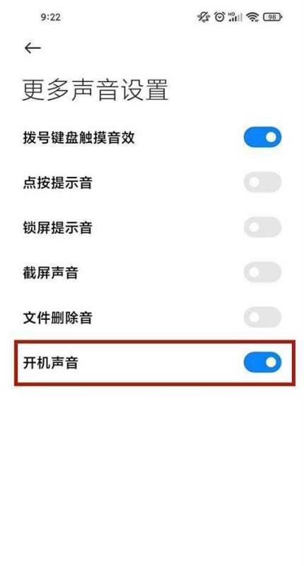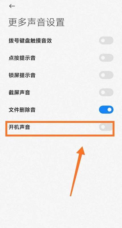 第三步:关闭开机声音开关在“更多声音与设置”界面中,找到开机声音选项,将其右侧的开关滑动至关闭状态(灰色表示关闭)。