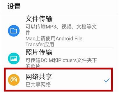 4、之后,用数据线连接手机和台式电脑,并在手机上出现的界面中选择网络共享选项: