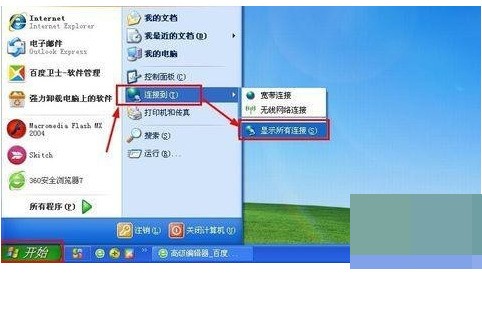 2、然后,在弹出菜单中找到“连接到”,把鼠标放在上面,会出现下级菜单,在其中找到“显示所有连接”单击: