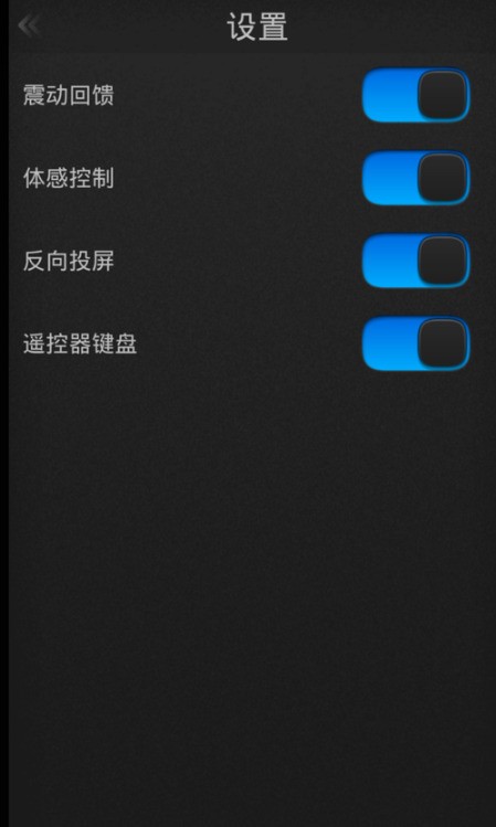先看设置,可以选取震动反馈、体感控制、反向投屏和遥控器键盘。如果不喜欢每次点击手机都震动,关了震动反馈就行,其他的建议开启