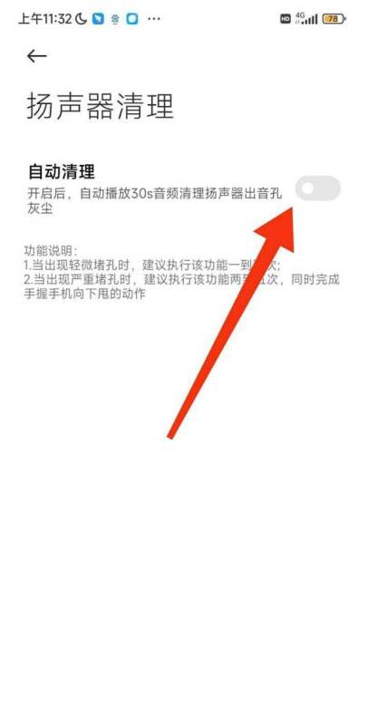 第三步:进入“更多设置”后,你需要找到并点击“扬声器清理”选项。此时,你会看到一个开关按钮,打开它,手机就会开始播放一段持续30秒的、音调不断变化的特殊音频。这段音频的设计是为了通过振动和音波来清理扬声器内部的灰尘。
