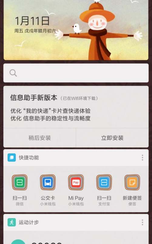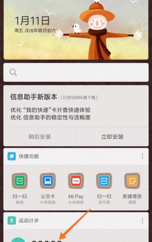 定位运动计步模块在负一屏下方找到“运动计步”一栏,此处会显示当前步数(如示例中的30000步)。点击该模块进入详情页面。