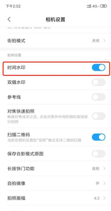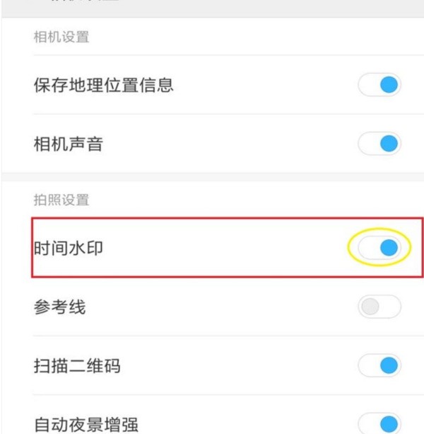 在第二栏:“拍照设置”的第一项,我们会找到“时间对若条脸末爱台陈影水印”四个字样,并且发现它是关闭状态。