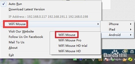 6.点击电脑端右下角的“MouseSever”图标,从其扩展面板中选择“WiFi Mouse”相应的项来实现连接。在此选择“WiFi Mouse”项。
