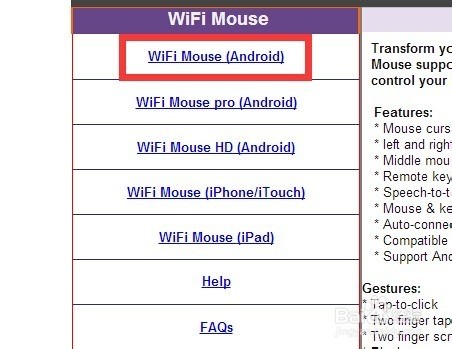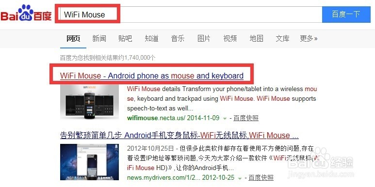 2.首先,我们需要获取可实现远程操作的手机和电脑端程序。大家可以直接在百度中搜索“WiFi Mouse”,并从搜索结果列表中选择第一项进入其官方网址。