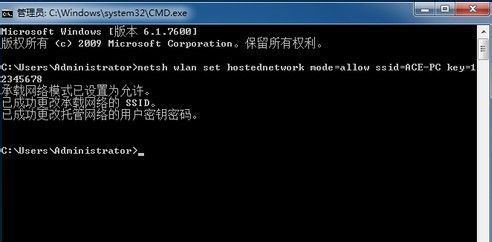 在界面里输入以下命令:netsh wlan set hostednetwork mode=allow ssid=ACE-PC key=12345678,回车运行 这个key=后面的数字是你要设置的密码,最少8个字符。可以自己设置哦!