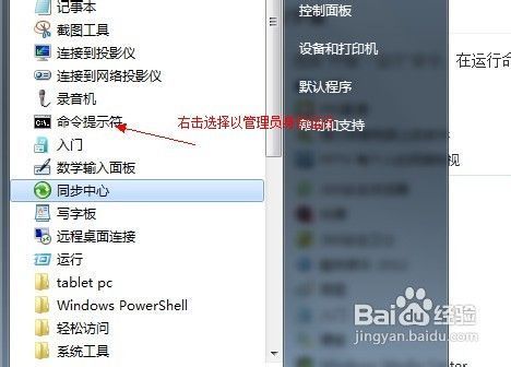 首先选择“开始”-程序-附件-命令提示符(记住不要直接运行),要右击以管理员身份运行。