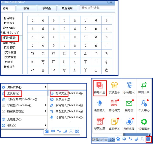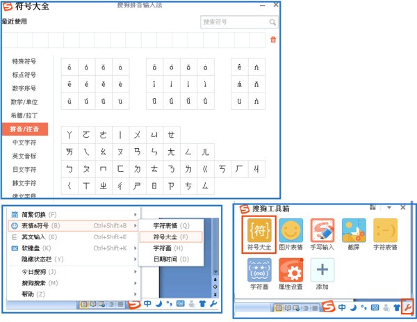 ①搜狗拼音输入法中,在输入法状态栏上按右键,在弹出的菜单中进入“表情&符号”中的“符号大全”,点“拼音/注音”选项,从其中选择需要的声调字母。也可以点“工具箱”,在搜狗工具箱中进入“符号大全”。