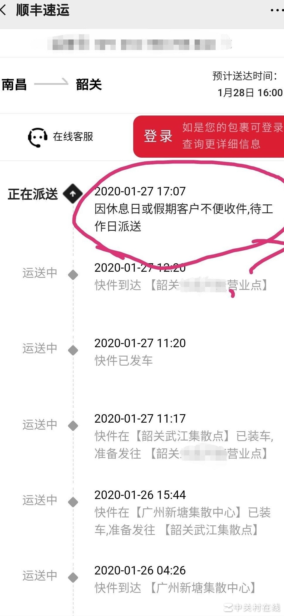 从图片明显可以看出,快递在南昌停留了整整三天,却显示已发车。南昌到深圳居然要三天时间?这速度还不如长途汽车横跨全国。更让人不解的是,我的收货地是韶关,为何偏要绕道深圳?原本承诺25号送达,之后一再推迟至26日下午、又改称当天,如今却以客户不便收件为由继续延迟。我已三次联系客服催促,反被说成我不方便?现在又要等到明天。你们自己宣称春节不打烊,还额外收费,结果服务却是这般水准?