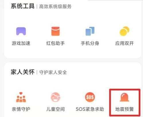 找到地震预警入口:在“家庭关怀”下方,点击“地震预警”图标。