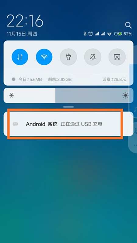 2、此时你会看到手机屏幕中间显示"正在通过USB充电"(这就是无法显示的元凶),点击方框中的内容直接进入USB连接方式选项;