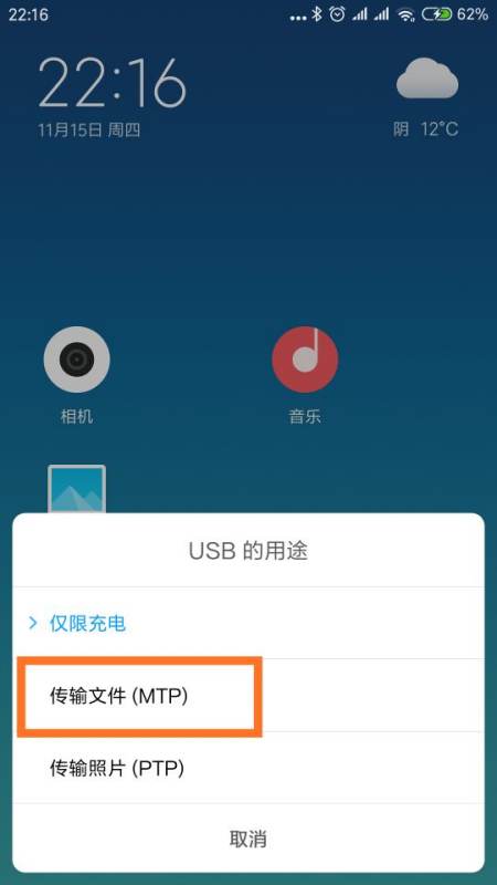 3、这时系统会要求你选择需要使用USB的用途,如果想作为可移动磁盘使用的话,当然要选择“传输文件(MTP)”;