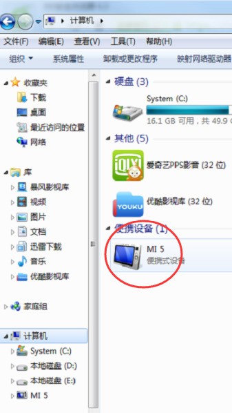 4、设置完成,回到你的电脑资源管理器,MI5手机就作为可移动磁盘出现了。