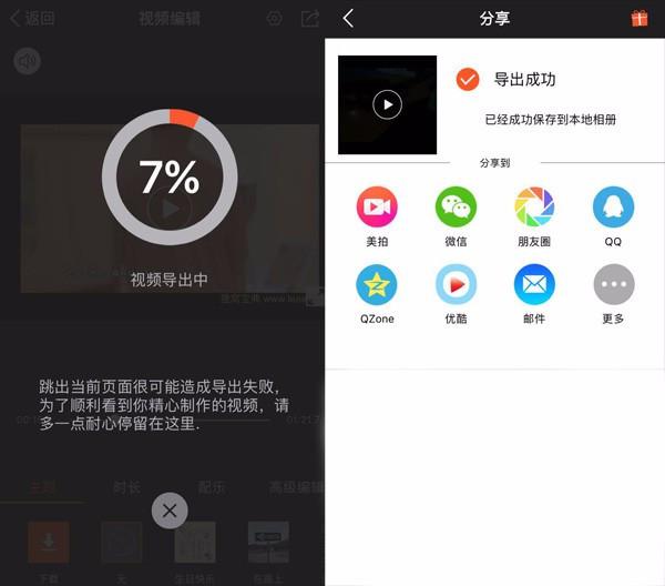 4.文字水印添加完成了,回到视频编辑界面中,可以保存视频了,就点击界面的右上角的“导出”按钮。保存视频有三种画质选择:快速导出、高清导出、超清导出。快速导出的话视频画质会稍微差一些,而导出速度也比较快,高清导出和超清导出的速度会稍微慢一些。所以选择你想要的画质导出即可。保存好的视频可以分享到其他地方。