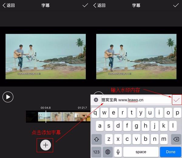3.进入到加字幕的界面,点击底部白色圆圈中间是加号的按钮,接着来到右边输入水印文字内容。给水印设置显示结束时间。