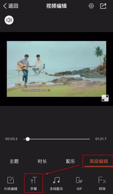 2.点击“高级编辑”在里面多个功能中选择“字幕”。给视频加字幕的形式加水印。