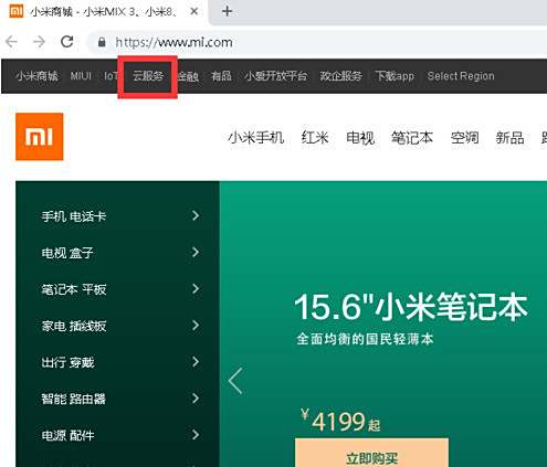 1、在电脑用浏览器打开小米官网,点击“云服务”。