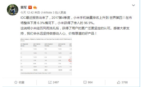 对此,小米公司董事长雷军在报告出来后发了封全员信以及微博表示祝贺,“这说明小米经历风雨洗礼后,获得了用户的更广泛更坚定的认可。感谢大家支持,我们会永远坚持做感动人心、价格厚道的好产品! ”