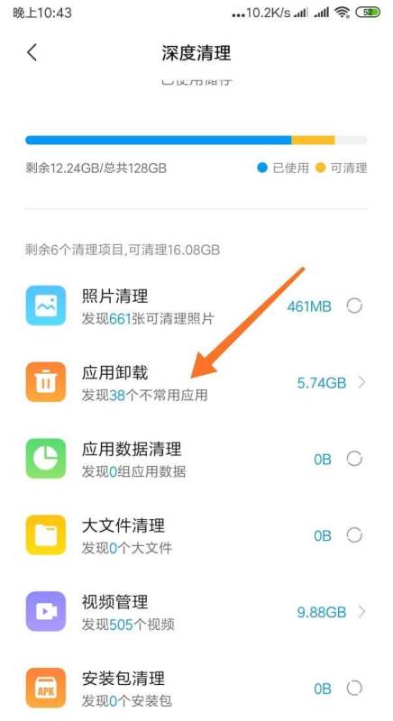 在存储空间设置界面中,滑动屏幕至最底部,找到并点击“垃圾清理”选项。这一步是为了进入小米手机的垃圾清理功能,它不仅可以清理垃圾文件,还可以批量卸载应用。