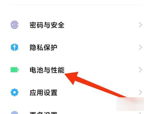 2、在手机设置页面中,点击进入电池与性能一栏。