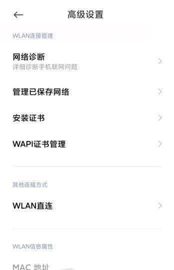 查看MAC地址:在高级设置界面中,找到“MAC地址”或“WLAN MAC地址”选项,即可查看当前设备的MAC地址。