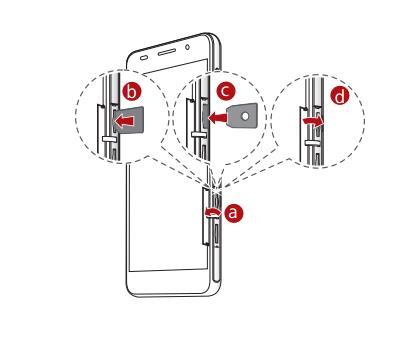 若要插入micro-sim 卡,请先关闭手机:1. 打开卡槽盖 (a)。 2. 将micro-sim 卡插入卡槽 (b)。 3. 使用插卡拨片按压micro-sim 卡尾部,直至micro-sim 卡锁入卡槽 (c)。 4. 合上micro-sim 卡槽盖 (d)。