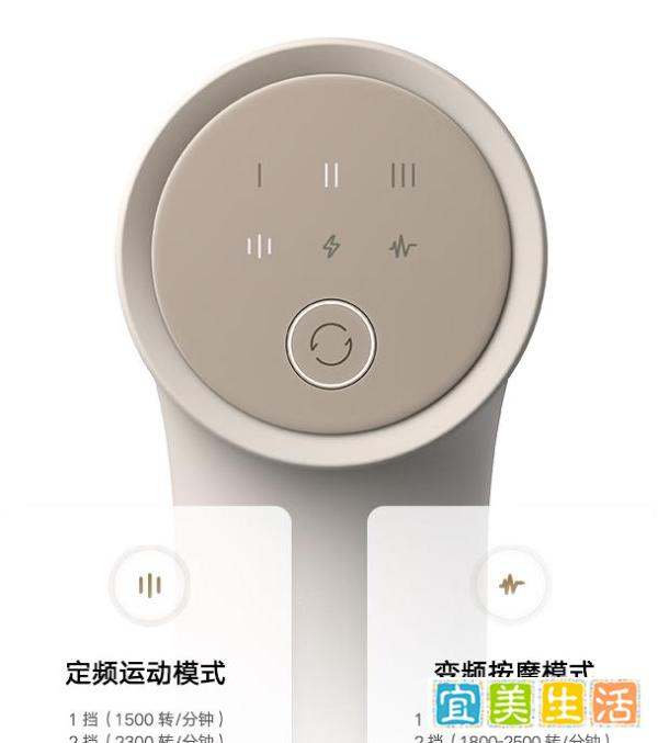 按摩模式:拥有定频运动和变频按摩两种模式,每个模式均有3个档位。定频运动适合运动前后快速放松,变频按摩适合日常按摩解乏。