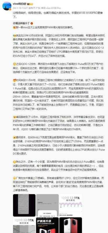 1月16日,vivo官宣iQOO 12与Neo9系列的2160Hz全高频调光功能上线。