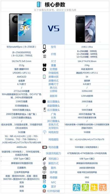 性能与芯片小米11 Ultra:搭载高通骁龙888处理器,配合满血版LPDDR5内存和UFS 3.1闪存,性能强劲,适合追求极致性能的用户。骁龙888在图形处理、AI计算等方面表现突出,能流畅运行大型游戏和多任务处理。华为Mate40 Pro:采用海思麒麟9000芯片,同样搭配LPDDR5和UFS 3.1。麒麟9000在能效比和AI算力上有优势,尤其在华为生态内(如多设备协同、智慧交互)体验更佳。若用户已拥有华为其他设备(如平板、手表),选择Mate40 Pro可实现更无缝的生态联动。屏幕显示小米11 Ultra:配备6.81英寸E4材质2K屏,支持120Hz刷新率,显示细腻且流畅。E4材质在亮度、对比度和功耗上表现优异,适合对屏幕素质要求高的用户,如观看高清视频、玩游戏等。华为Mate40 Pro:采用6.76英寸AMOLED曲面屏,刷新率为90Hz。虽然刷新率略低,但曲面设计提升了视觉沉浸感,且AMOLED屏幕色彩鲜艳、对比度高。若用户偏好曲面屏的观感和手感,Mate40 Pro是更好的选择。拍照能力小米11 Ultra:后置三摄组合为5000万像素主摄+4800万像素超广角+4800万像素潜望长焦,支持120倍潜望式变焦和四轴OIS防抖。其变焦能力在同价位机型中处于领先地位,适合喜欢拍摄远景或需要高倍变焦的用户。华为Mate40 Pro:后置三摄为5000万像素主摄+2000万像素电影镜头(超广角)+1200万像素长焦镜头,支持50倍数字变焦和OIS防抖。华为在影像算法上有深厚积累,尤其在夜景、人像等场景下表现突出。若用户更注重拍照的综合体验(如色彩还原、动态范围),Mate40 Pro更值得考虑。续航与充电小米11 Ultra:内置5000mAh硅氧负极电池,支持67W有线闪充。大容量电池和快充技术确保了长时间的续航和快速回血,适合重度使用或经常外出的用户。华为Mate40 Pro:电池容量为4400mAh,支持66W有线闪充。虽然电池容量略小,但麒麟9000的能效比优化使得实际续航表现并不逊色。若用户对续航要求不是极高,Mate40 Pro的充电速度也能满足日常需求。机身设计与手感小米11 Ultra:机身尺寸为164.374.68.38mm,重量234g,属于较厚重机型。其陶瓷后盖和金属中框提升了质感,但长时间握持可能会感到疲劳。华为Mate40 Pro:机身尺寸为162.9x75.5x9.1mm,重量212g,相对更轻薄。曲面屏设计使得握持手感更舒适,适合追求轻薄和手感的用户。功能与生态小米11 Ultra:支持NFC、红外遥控、线性马达和哈曼卡顿立体声双扬声器,功能丰富。若用户需要红外遥控家电或追求高品质音频体验,小米11 Ultra是更好的选择。华为Mate40 Pro:同样支持NFC、红外遥控和线性马达,但扬声器为普通立体声双扬声器。其优势在于华为生态的协同能力,如与华为平板、手表等设备的快速连接和互动。核心配置对比图