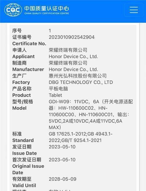 近日,有网友爆料称一款全新的荣耀平板机型已经通过了国家质量3C认证。据相关消息透露,该平板型号为GDI-W09,不仅支持66W有线快充,还兼容40W UFCS融合快充技术。这一消息引起了广泛关注,预示着荣耀即将推出一款配备强劲快充功能的新款平板。