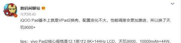 iQOO Pad平板参数曝光,性能配置更激进