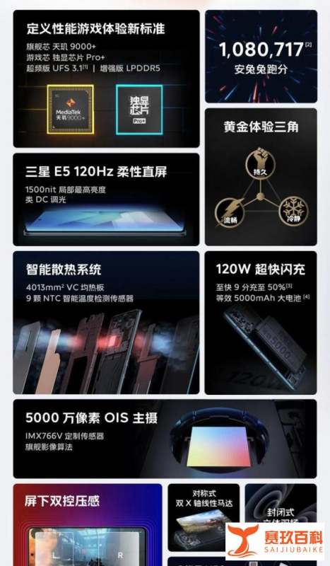 核心配置处理器:联发科天玑9000+,搭配LPDDR5内存和UFS 3.1闪存,性能接近旗舰级水准。散热系统:内置4013mm2 VC均热板,配合Pixelworks独立显示芯片Pro+,有效提升游戏帧率稳定性并降低功耗。屏幕:6.78英寸三星E5材质AMOLED屏,分辨率2400×1080,支持120Hz刷新率、屏下双压感,峰值亮度达1500nits,户外可视性优秀。