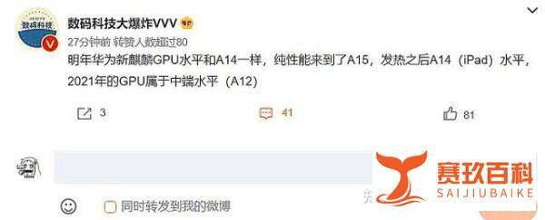 爆料者还指出,新款麒麟处理器在发热控制后性能可达到A14(iPad)水平,而2021年的麒麟9000处理器GPU性能仅相当于A12中端水平。这表明新款处理器在性能上实现了跨越式发展。