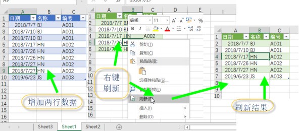 3. 当Sheet1中增加新日期数据时,只要对生成的结果表格刷新(右击任意数据单元格后选择刷新),即可得到与更新的结果。