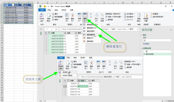 1. 光标定位到数据区域,数据菜单——获取或转换数据——自表或区域,确定后转到PQ界面。在PQ中只要一个步骤即可,删除行中的重复项