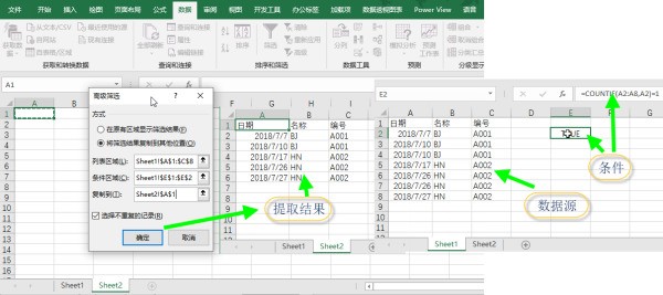 2. 激活Sheet2,数据菜单——排序与筛选——高级,列表区域选择Sheet1中的数据区域,条件区域选择E1:E2(要选择条件及上面一个空单元格),勾选“将筛选结果复制到其他位置”后,选择Sheet2的A1为目标位置。确定。