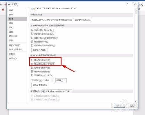 在页面右边找到【在Word中更正拼写和语法时】这一栏,将其下方的【键入时检查拼写】和【建入时标记语法错误】这两项前面的来自√去掉,点击确定,如图5
