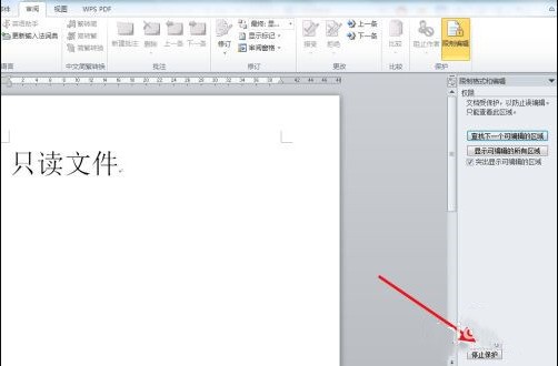 3.如果只读文件有密码保护,则将文件打开,然后依次点击“审阅”-“限制编辑”。然后点击选择“停止保护”,输入密码即可进行编辑;