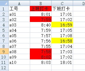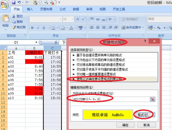 第二步:选择C列,点击条件格式-新建规则-使用公式设置单元格格式。并输入公式:=C2<TIME(17,0,0),然后设置格式为黄色。如图: