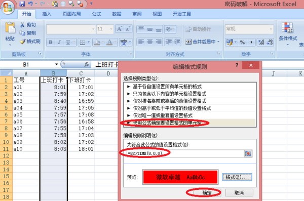 第一步:选择B列,点击条件格式-新建规则-使用公式设置单元格格式。并输入公式:=B2>TIME(8,0,0),然后设置格式为红色。如图: