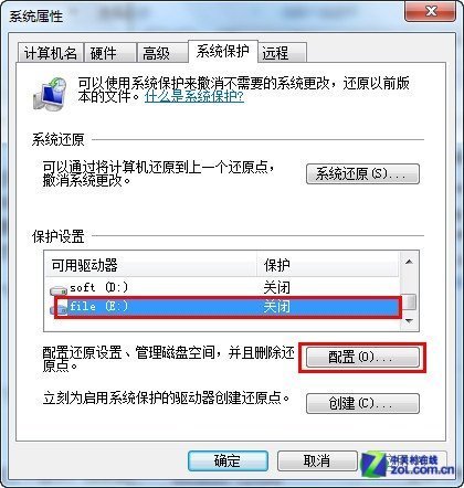 在“保护设置”列表中,选中需要开启还原点设置的驱动器,点击“配置”按钮。