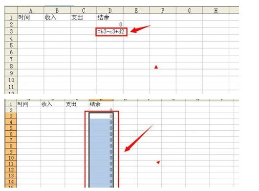 4.的根据实际情况知道,我们的结余应该等于当日收支差加上以前的结余,所以再定义D3的键值“=b3-c3+d2”,然后用鼠标点中D3格,下拉鼠标,就会让D列所有空白格均遵循D3的函数,进行计算。如下图所示。