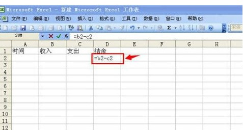 3.然后定义B1为“收入”、C1为“支出”、D1为“结余”,然后就可以定义函数了,这个比较有意思,也很重要。我们点中D2格,然后在D2键值内容里填入“=b2-c2”。