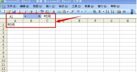 2.用鼠标点中A1空白格,这时候在工具栏A1后面出现空白“值”,在这里输入的内容就会出现在A1格内,称之为A1的键值。这里小编定义A1列为时间列。