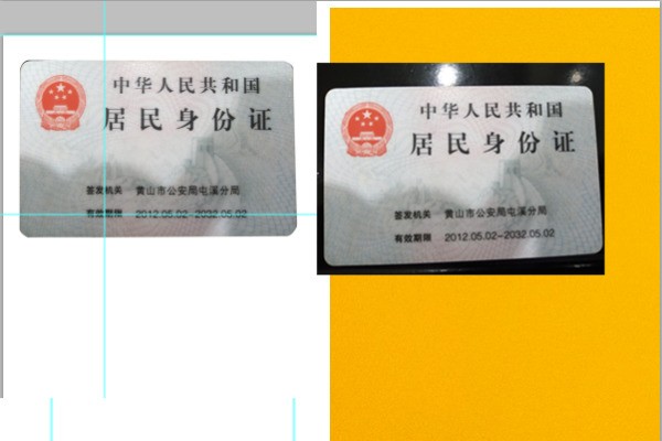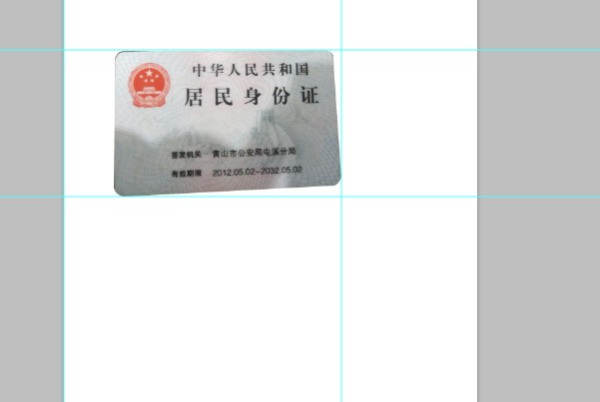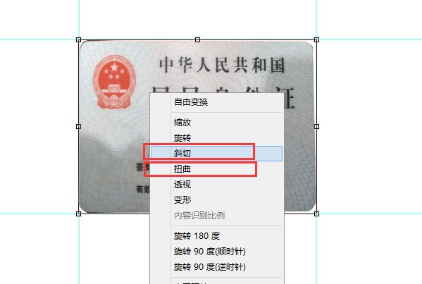 7、依据身份证的长宽尺寸将4条参考线的区域设置好以后,按键盘上的ctrl和T键,分别选择斜切,调整该图片至端正的状态。