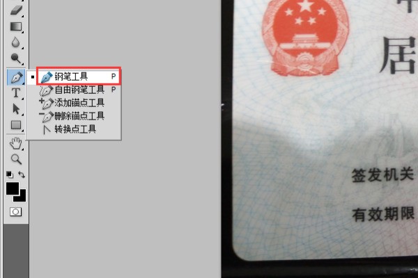 3、打开该身份证相片以后选择钢笔工具,将木年饭告身份证勾选出来。