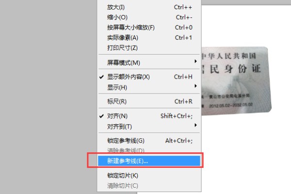 5、推医职在PS中新建一个A4纸张大小的画布,将该勾选的身份证托移到画布上。然后点击菜单栏的视图,选择新玉门来建参考线。